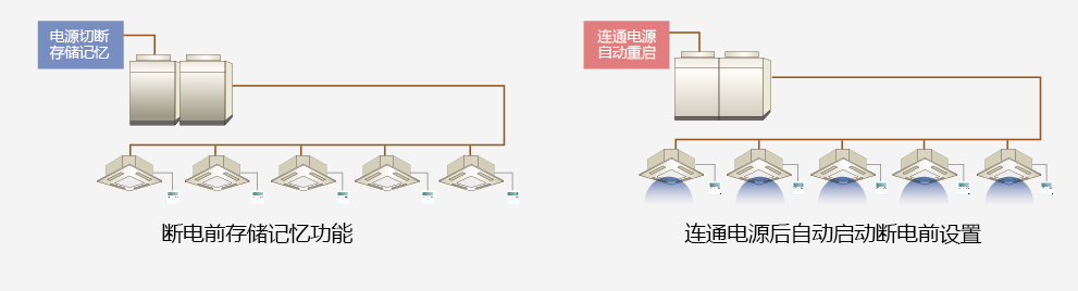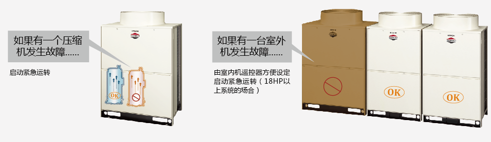 室外机的两个压缩机中有一个发生故障,另一个压缩机也能进行紧急运转。在超过18HP的系统中,如果一台室外机发生故障,其余室外机也能进行紧急运转。