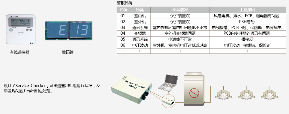 通过有线遥控器显示或者在室外机借助于数码管显示,可以轻松获得故障自诊断信息,监控系统运行状况,方便运行管理及维护。