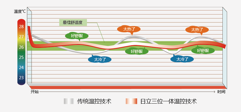 和传统多联机室内温度控制依据室内机回风温度和遥控器温度传感器温度不同,日立追加了出风温度传感器,通过微电脑控制2000脉冲的高精度电子膨胀阀调节制冷剂流量,在满足室内温控精度±0.5℃的同时,同时将出风温度控制在最佳的范围,更好地满足人体舒适性。