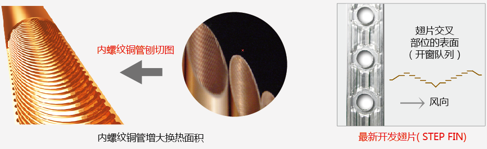 新型高性能的热交换器采用直径为Φ7.0的内螺纹高效导热铜管和新型翅片(STEP FIN),降低了空气流动阻力,换热更均匀...