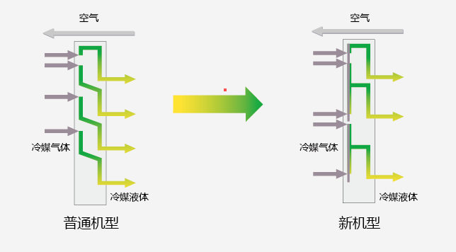 通过特殊设计的“2-1”制冷剂流程,热交换器换热效率得以优化。