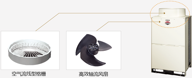 日立不断钻研并开发了可减少风扇周围产生紊流的新型扇叶形状高效轴流风扇,在满足换热风量和机外静压的基础上,确保功耗更小、噪音更低。