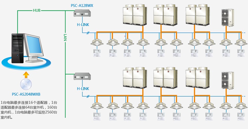 1台电脑最多连接16个适配器,1台适配器最多连接64台室外机,160台室内机,1台电脑最多可监控2560台室内机。