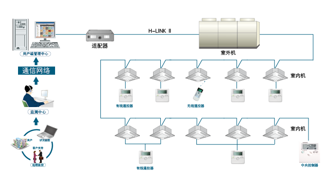 日立空调中央管理系统可实现将全部空调室内机机组与电脑连接起来,通过电脑实现系统全部自控,功能强大,操作简单明了;还可通过通信网络,实现远程监控。