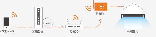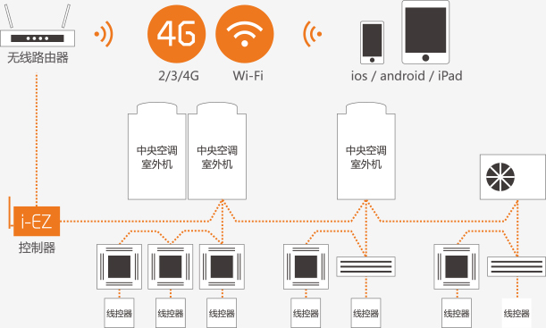 日立i-EZ远程控制系统由移动端(iPad、iPhone、Android手机)、适配器、无线路由器(或4G网络)组成。最多可控16台室外机,32台室内机。