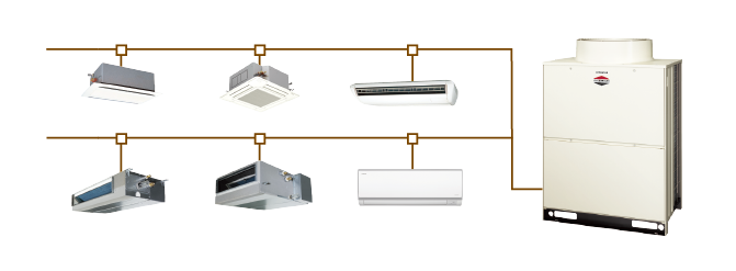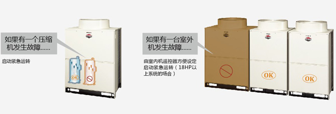 室外机的两个压缩机中有一个发生故障,另一个压缩机也能进行紧急运转。在超过18HP的系统中,如果一台室外机发生故障,其余室外机也能进行紧急运转。