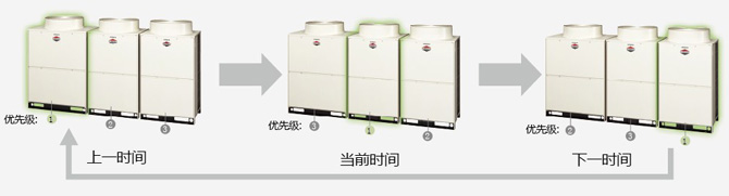 通过轮换运转技术,均衡了室外机模块的运行时间,提高了机组耐久性,延长了空调系统的使用寿命。