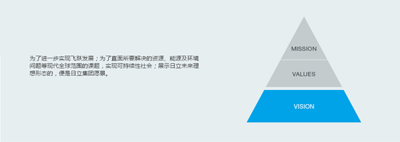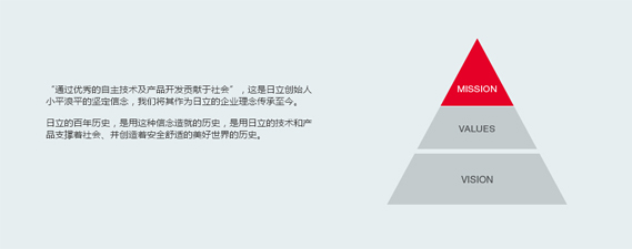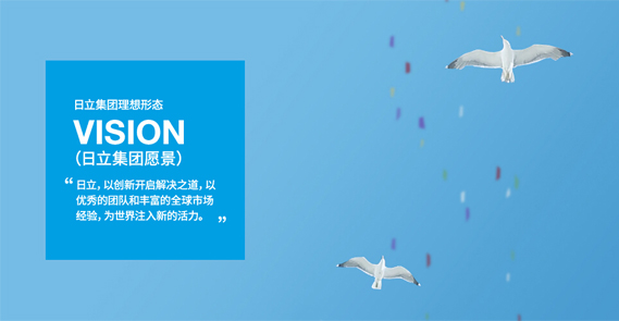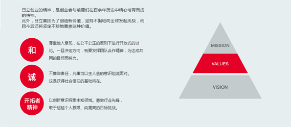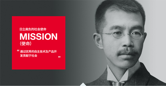 1910年,小平浪平创建了日立。在100多年的发展历程中,日立始终秉承“和”、“诚”、“开拓者精神”的创业精神,以及“通过优秀的自主技术及产品开发贡献于社会”的企业理念,实现了事业的传承和不断壮大。在世界经济瞬息万变的大背景下,日立制订了全新的愿景,即“日立,以创新开启解决之道,以优秀的团队和丰富的全球市场经验,为世界注入新的活力”,并构筑起日立集团核心价值观,以期用崭新的精神面貌为社会的发展做出更大贡献。
