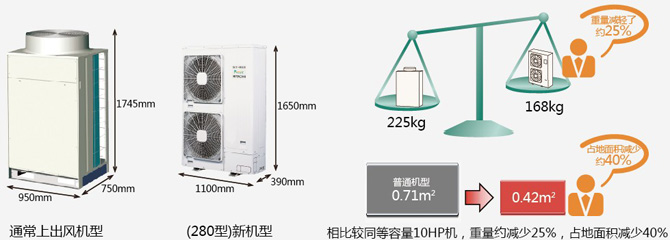 室外机采用侧面出风的小型化轻量化设计,机型尺寸为1650(H)×1100(W)×390(D),相比较同容量的普通型产品,占地面积和重量大幅度减小。