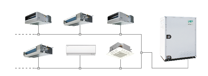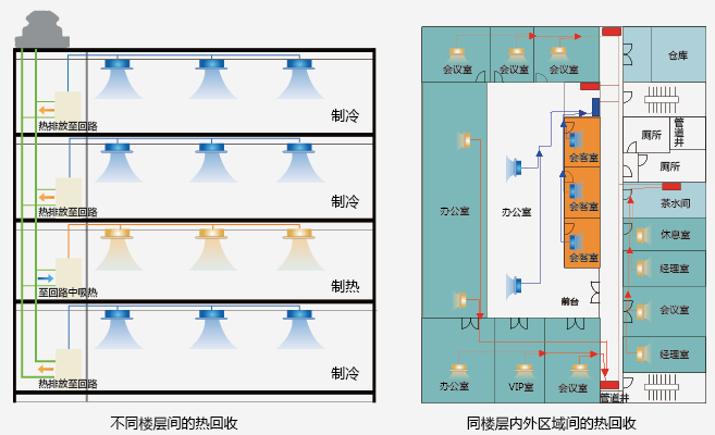 通过系统水环路设计,可满足现代建筑在同一时间不同区域制热和制冷的需求,达到余热回收效果,实现最大程度节能。