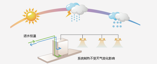 系统采用稳定的水源、地源作为冷热源,水源多联机制冷时不受高温影响,在炎热的夏季高温环境中,制冷能力不衰减。在制热运行中由于室外侧热源温度较高,且基本不会随室外环境温度变化而波动,室外侧不存在结霜和除霜的过程,换热稳定效率高,制热强劲,在寒冷地区使用不受环境温度影响。