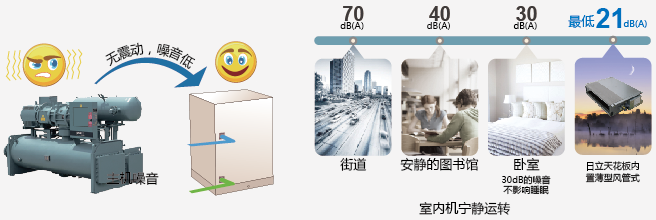 日立水源变频多联机主机采用板式换热器实现水与制冷剂之间的高效换热,运行噪音只有53dB(A)(全工况280型)。室内机采用优质的高效调速电机,运转噪音低,室内机最低噪音仅为21dB(A)。