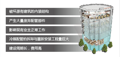 原有中央空调系统的设计安装与建筑物结构、建筑功能密切相关,共同构建起一个协调的建筑物系统,而单纯的中央空调的改造升级是打破原有系统重新构建的过程,其繁杂程度有时让很多业主望而却步。