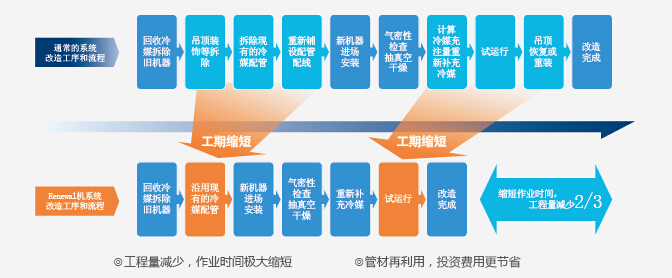 Renewal更新机,应用领先的技术使得一定条件下原配管及线路可充分再利用,无需拆装建筑物吊顶等重新铺设管路,节省工作量更节约耗材,让旧系统充分发挥潜在价值。