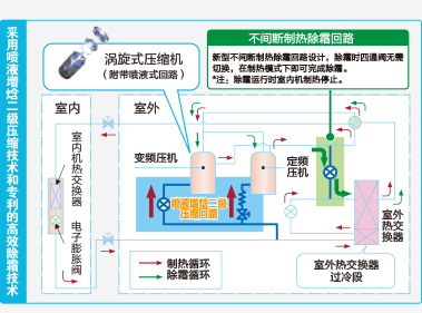 喷液增焓二级压缩技术和专利的高效除霜技术,保障机组低温强力制热能力